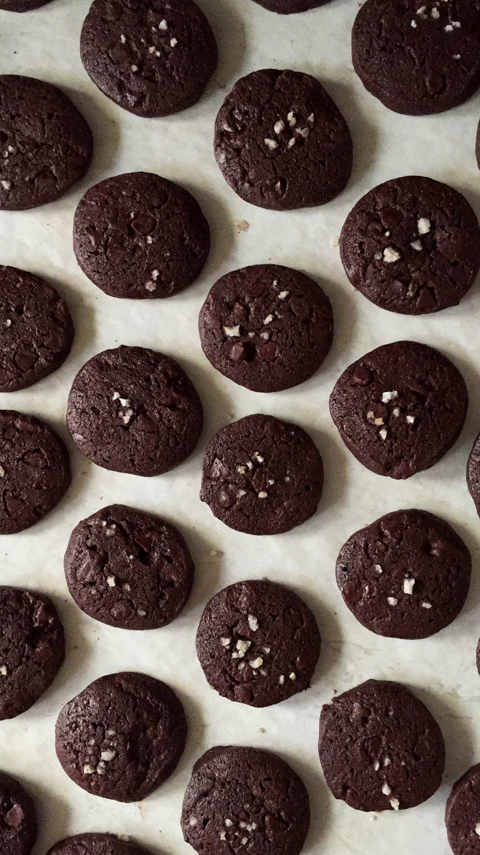 Dark chocolate sablés made with intense cacao, generously studded with chocolate chips. Finished with a hint of seasalt