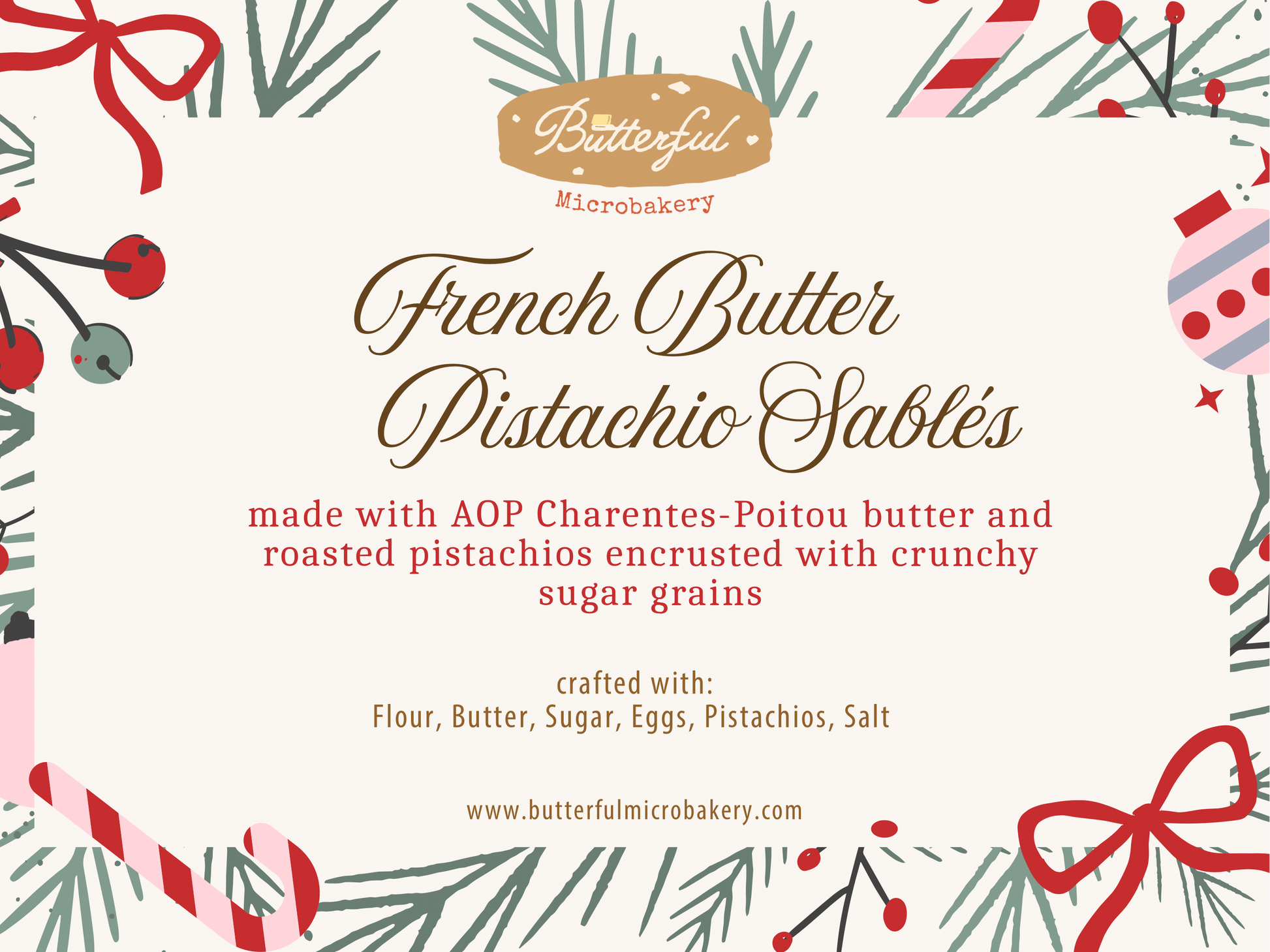 Made with AOP Charentes-Poitou butter, studded with roasted pistachios and encrusted with crunchy sugar grains